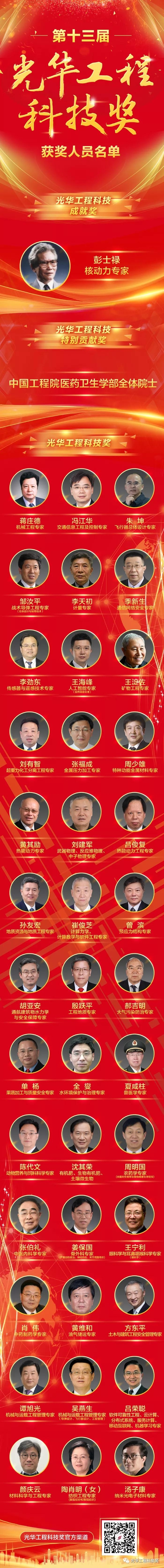 11月8日,第十三屆光華工程科技獎揭曉儀式在北京隆重舉行。中國兵器工業(yè)集團有限公司科技委副主任委員、戰(zhàn)術導彈工程專家鄒汝平獲第十三屆光華工程科技獎(獲獎人員全名單及鄒汝平事跡附后)。 光華工程科技獎由中國工程院主管,每兩年頒發(fā)一次,目前已是第十三屆,被譽為“中國工程界最高獎項”,極大地激勵了我國工程師、科學家從事工程科技研究、發(fā)展、應用的積極性和創(chuàng)造性。根據(jù)光華工程科技獎候選人提名要求,候選人需在重大工程設計、研制、建造、生產(chǎn)、運行、管理等方面解決關鍵科學技術問題或在工程科學技術及工程管理領域有重要發(fā)現(xiàn)、發(fā)明,并有顯著應用成效,或者是應用本人研究成果、發(fā)明創(chuàng)造,發(fā)展高新技術及相關產(chǎn)業(yè),成效特別顯著者才可提名。今年,全國范圍內(nèi)共產(chǎn)生了296名有效候選人。 此次揭曉儀式正式公布了從296名候選人中評選出的第十三屆光華工程科技成就獎、光華工程科技特別貢獻獎以及光華工程科技獎的獲得者,最終僅有40位專家和1個團體獲獎。本屆光華工程科技獎的獲獎科學家們,緊密圍繞國家重大戰(zhàn)略需求,瞄準經(jīng)濟建設和事關國家安全的重大工程科技問題,緊貼新時代社會民生現(xiàn)實需求和軍民融合需求,加快自主創(chuàng)新成果轉(zhuǎn)化應用,為創(chuàng)新驅(qū)動發(fā)展,建設科技強國,以及實現(xiàn)“兩個一百年”奮斗目標和中國夢做出了重要貢獻。 獲獎人員全名單