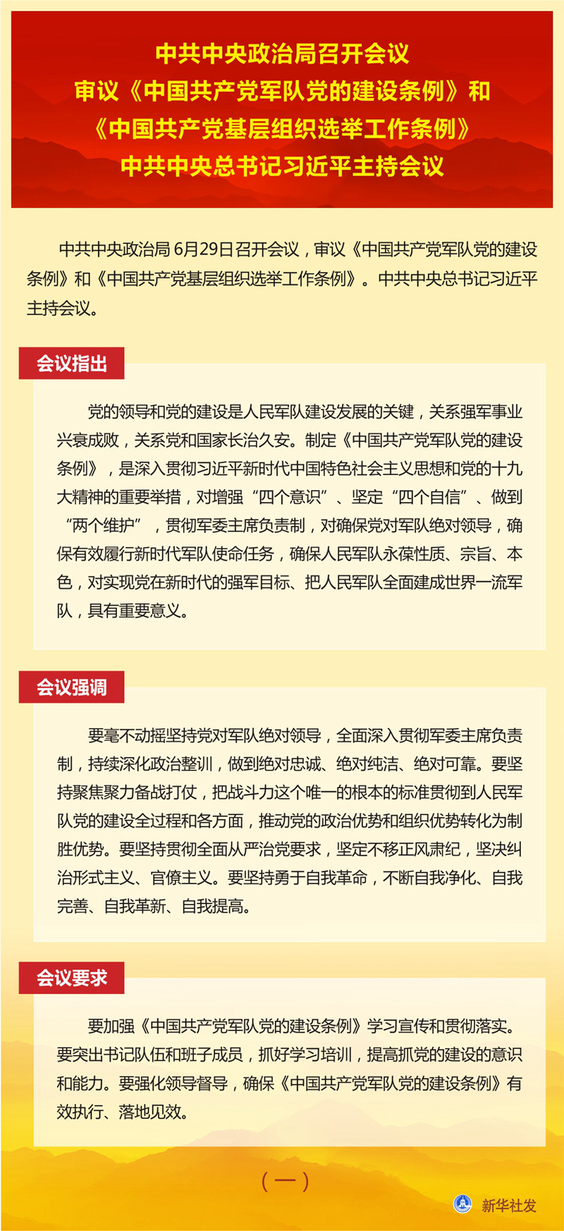 中共中央政治局召開會議 審議《中國共產黨軍隊黨的建設條例》和《中國共產黨基層組織選舉工作條例》 中共中央總書記習近平主持會議 新華社北京6月29日電 中共中央政治局6月29日召開會議,審議《中國共產黨軍隊黨的建設條例》和《中國共產黨基層組織選舉工作條例》。中共中央總書記習近平主持會議。 會議指出,黨的領導和黨的建設是人民軍隊建設發(fā)展的關鍵,關系強軍事業(yè)興衰成敗,關系黨和國家長治久安。制定《中國共產黨軍隊黨的建設條例》,是深入貫徹習近平新時代中國特色社會主義思想和黨的十九大精神的重要舉措,對增強“四個意識”、堅定“四個自信”、做到“兩個維護”,貫徹軍委主席負責制,對確保黨對軍隊絕對領導,確保有效履行新時代軍隊使命任務,確保人民軍隊永葆性質、宗旨、本色,對實現黨在新時代的強軍目標、把人民軍隊全面建成世界一流軍隊,具有重要意義。 會議強調,要毫不動搖堅持黨對軍隊絕對領導,全面深入貫徹軍委主席負責制,持續(xù)深化政治整訓,做到絕對忠誠、絕對純潔、絕對可靠。要堅持聚焦聚力備戰(zhàn)打仗,把戰(zhàn)斗力這個唯一的根本的標準貫徹到人民軍隊黨的建設全過程和各方面,推動黨的政治優(yōu)勢和組織優(yōu)勢轉化為制勝優(yōu)勢。要堅持貫徹全面從嚴治黨要求,堅定不移正風肅紀,堅決糾治形式主義、官僚主義。要堅持勇于自我革命,不斷自我凈化、自我完善、自我革新、自我提高。 會議要求,要加強《中國共產黨軍隊黨的建設條例》學習宣傳和貫徹落實。要突出書記隊伍和班子成員,抓好學習培訓,提高抓黨的建設的意識和能力。要強化領導督導,確?!吨袊伯a黨軍隊黨的建設條例》有效執(zhí)行、落地見效。 會議指出,黨的十八大以來,以習近平同志為核心的黨中央高度重視基層黨組織選舉工作,對堅持和加強黨的全面領導、貫徹執(zhí)行民主集中制、規(guī)范完善黨內選舉制度作出一系列重大部署,有力推動了基層黨組織建設。制定和實施《中國共產黨基層組織選舉工作條例》,是落實黨要管黨、全面從嚴治黨要求,是發(fā)揚黨內民主、尊重黨員民主權利、規(guī)范基層黨組織選舉的具體舉措,對增強基層黨組織政治功能和組織力,把基層黨組織建設成為宣傳黨的主張、貫徹黨的決定、領導基層治理、團結動員群眾、推動改革發(fā)展的堅強戰(zhàn)斗堡壘,鞏固黨長期執(zhí)政的組織基礎,具有重要意義。 會議強調,要嚴格執(zhí)行選舉制度規(guī)定,提高黨內選舉質量,保障黨章賦予的黨員權利,增強黨的意識、政治意識、規(guī)矩意識。要嚴格代表資格條件,確保選出合格的代表。要合理分配代表名額,優(yōu)化代表結構,確保生產和工作一線代表比例。要按照德才兼?zhèn)洹⒁缘聻橄群桶嘧咏Y構合理的原則提名委員候選人。要堅持教育在先、警示在先、預防在先,嚴肅政治紀律、組織紀律和換屆紀律,確保選舉風清氣正。 會議要求,各級黨委要加強對《中國共產黨基層組織選舉工作條例》實施的組織領導,嚴格落實黨委主體責任,加強謀劃,精心組織,全程把關。要貫徹執(zhí)行民主集中制,教育引導黨員和代表正確行使民主權利,保證選舉工作平穩(wěn)有序。要強化基層黨組織書記和黨務骨干培訓,提升工作規(guī)范化水平。要加強督促落實,確?!吨袊伯a黨基層組織選舉工作條例》各項規(guī)定要求落到實處。 會議還研究了其他事項。 |