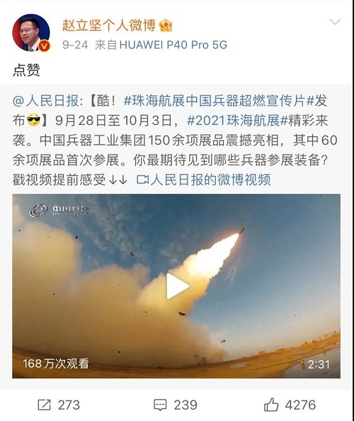人民日?qǐng)?bào)、新華社、中國(guó)日?qǐng)?bào)、共青團(tuán)中央、國(guó)資小新、騰訊軍事、鳳凰軍事、新浪軍事等新媒體發(fā)布的集團(tuán)公司航展宣傳片等視頻作品燃爆全網(wǎng),閱讀量突破三千萬(wàn)人次,得到外交部發(fā)言人趙立堅(jiān)轉(zhuǎn)載點(diǎn)贊。集團(tuán)公司微信、微博、抖音號(hào)、微信視頻號(hào)等新媒體宣傳片播放閱讀量超過(guò)400萬(wàn)人次。同時(shí),央視新聞、新華社、中國(guó)之聲、央視軍事、央視新媒體、解放軍報(bào)、共青團(tuán)中央、國(guó)資小新、環(huán)球時(shí)報(bào)等多家媒體對(duì)集團(tuán)公司靜、動(dòng)態(tài)展區(qū)進(jìn)行現(xiàn)場(chǎng)直播,在電視端、客戶端、微信視頻號(hào)、微博、B站、快手、抖音等平臺(tái)受到高度關(guān)注。著名軍事專家杜文龍、央視主持人顧國(guó)寧、央廣中國(guó)之聲主持人王藝等直播兵器館、動(dòng)態(tài)表演區(qū)裝備。