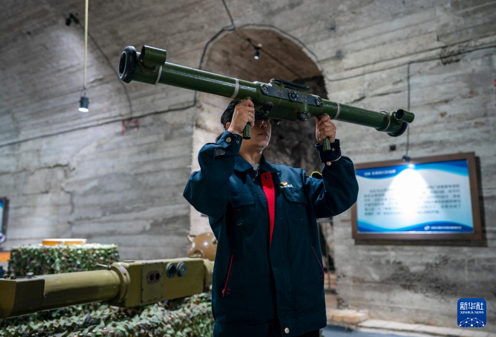 5月16日,一名工作人員在中國光學(xué)歷史博物館內(nèi)展示對(duì)空測(cè)距機(jī)使用方法。