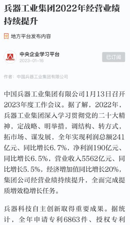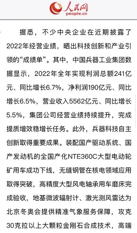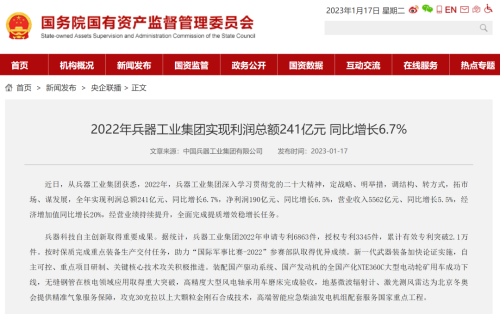 1月13日,中國(guó)兵器工業(yè)集團(tuán)有限公司召開2023年度工作會(huì)議,傳達(dá)學(xué)習(xí)中央領(lǐng)導(dǎo)同志、軍方首長(zhǎng)和上級(jí)部門重要批示,總結(jié)集團(tuán)公司2022年工作,研究部署2023年主要工作任務(wù)。 集團(tuán)公司2022年重點(diǎn)工作取得的成績(jī)及下一步的改革發(fā)展受到社會(huì)媒體廣泛關(guān)注。新華社、新華財(cái)經(jīng)、人民網(wǎng)、經(jīng)濟(jì)日?qǐng)?bào)客戶端、光明日?qǐng)?bào)客戶端、中國(guó)日?qǐng)?bào)網(wǎng)、中國(guó)科技網(wǎng)、中國(guó)新聞網(wǎng)、央廣網(wǎng)、國(guó)資委網(wǎng)站、學(xué)習(xí)強(qiáng)國(guó)中央企業(yè)學(xué)習(xí)平臺(tái)、新浪網(wǎng)、騰訊網(wǎng)、搜狐網(wǎng)、網(wǎng)易網(wǎng)、今日頭條等中央主流媒體、國(guó)家部委網(wǎng)站及知名網(wǎng)絡(luò)媒體對(duì)集團(tuán)公司工作會(huì)議進(jìn)行了報(bào)道,重點(diǎn)關(guān)注集團(tuán)公司高質(zhì)量發(fā)展、科技創(chuàng)新、戰(zhàn)略性新興產(chǎn)業(yè)培育、深化改革、國(guó)際化經(jīng)營(yíng)、履行央企社會(huì)責(zé)任等內(nèi)容。其中新華社以《北斗時(shí)空智能服務(wù)平臺(tái)累計(jì)服務(wù)終端數(shù)突破15億》為題,重點(diǎn)報(bào)道了集團(tuán)公司2022年在自主創(chuàng)新、戰(zhàn)略新興產(chǎn)業(yè)培育、專利申請(qǐng)等方面取得的成績(jī);經(jīng)濟(jì)日?qǐng)?bào)客戶端、光明日?qǐng)?bào)客戶端、中國(guó)日?qǐng)?bào)網(wǎng)等以《兵器工業(yè)集團(tuán)2022年經(jīng)營(yíng)業(yè)績(jī)持續(xù)提升》為題,重點(diǎn)報(bào)道了集團(tuán)公司在高質(zhì)量發(fā)展、全面完成提質(zhì)增效穩(wěn)增長(zhǎng)方面取得的成績(jī)。集團(tuán)公司門戶網(wǎng)站、微信公眾號(hào)、微博等新媒體也對(duì)集團(tuán)公司工作會(huì)議進(jìn)行了及時(shí)報(bào)道,各成員單位紛紛對(duì)相關(guān)內(nèi)容進(jìn)行轉(zhuǎn)載,引發(fā)全系統(tǒng)關(guān)注。 新華社:北斗時(shí)空智能服務(wù)平臺(tái)累計(jì)服務(wù)終端數(shù)突破15億 新華財(cái)經(jīng):兵器工業(yè)集團(tuán)2022年實(shí)現(xiàn)凈利潤(rùn)190億元 同比增長(zhǎng)6.5% 人民網(wǎng):2022年中央企業(yè)營(yíng)收同比增長(zhǎng)8.3% 科技創(chuàng)新成效顯著 經(jīng)濟(jì)日?qǐng)?bào)客戶端:兵器工業(yè)集團(tuán)2022年經(jīng)營(yíng)業(yè)績(jī)持續(xù)提升 光明日?qǐng)?bào)客戶端:兵器工業(yè)集團(tuán)2022年經(jīng)營(yíng)業(yè)績(jī)持續(xù)提升 中國(guó)日?qǐng)?bào)網(wǎng):兵器工業(yè)集團(tuán)2022年經(jīng)營(yíng)業(yè)績(jī)持續(xù)提升 中國(guó)科技網(wǎng):兵器工業(yè)集團(tuán)2022年實(shí)現(xiàn)利潤(rùn)總額241億元 中國(guó)新聞網(wǎng):2022年兵器工業(yè)集團(tuán)實(shí)現(xiàn)利潤(rùn)總額241億元 同比增長(zhǎng)6.7% 國(guó)資委網(wǎng)站:2022年兵器工業(yè)集團(tuán)實(shí)現(xiàn)利潤(rùn)總額241億元 同比增長(zhǎng)6.7% 學(xué)習(xí)強(qiáng)國(guó)中央企業(yè)學(xué)習(xí)平臺(tái):兵器工業(yè)集團(tuán)2022年經(jīng)營(yíng)業(yè)績(jī)持續(xù)提升 集團(tuán)公司職工及廣大網(wǎng)友熱議工作會(huì)議 “這次會(huì)議全面總結(jié)了2022年工作,深入分析研判當(dāng)前形勢(shì),部署2023年重點(diǎn)工作,為我們做好2023年及今后一個(gè)時(shí)期的工作明確了目標(biāo)、堅(jiān)定了信心?!?/p> “作為兵工人,我要苦練內(nèi)功、不懼挑戰(zhàn)、奮勇向前,為建設(shè)具有全球競(jìng)爭(zhēng)力的世界一流集團(tuán)公司貢獻(xiàn)自己的力量?!?/p> “聚焦高科技領(lǐng)域,制造更多的大國(guó)重器,讓更多的產(chǎn)品服務(wù)老百姓?!?/p> “在不平凡的2022年取得了亮眼的工作成績(jī),為兵器工業(yè)點(diǎn)贊?!?/p> “希望能有更多新型武器裝備部隊(duì),2023年,望你們?cè)賱?chuàng)輝煌,加油!” |