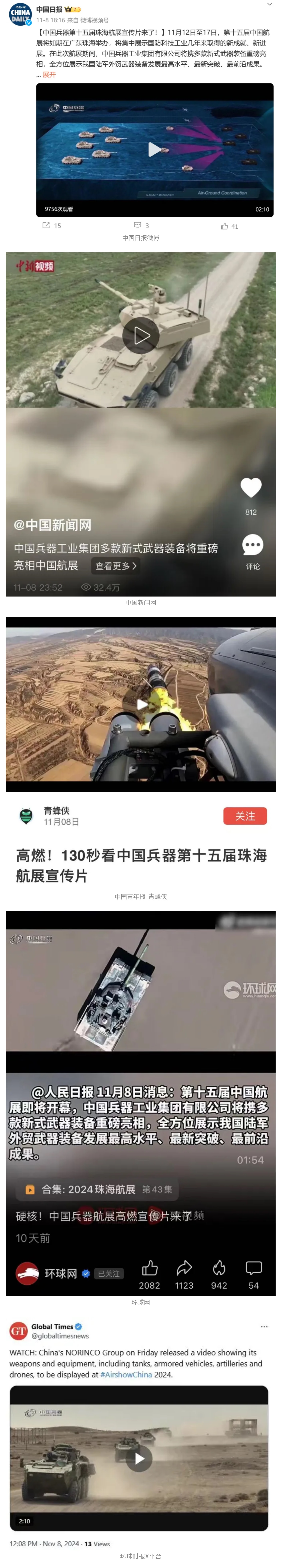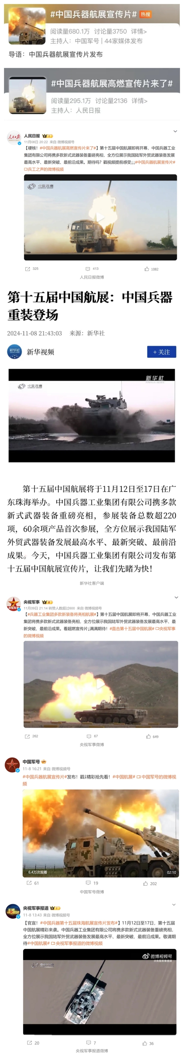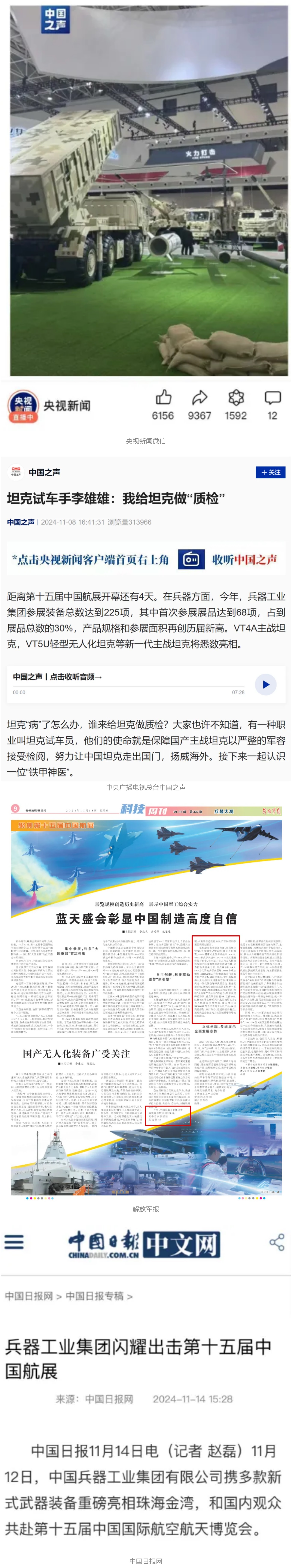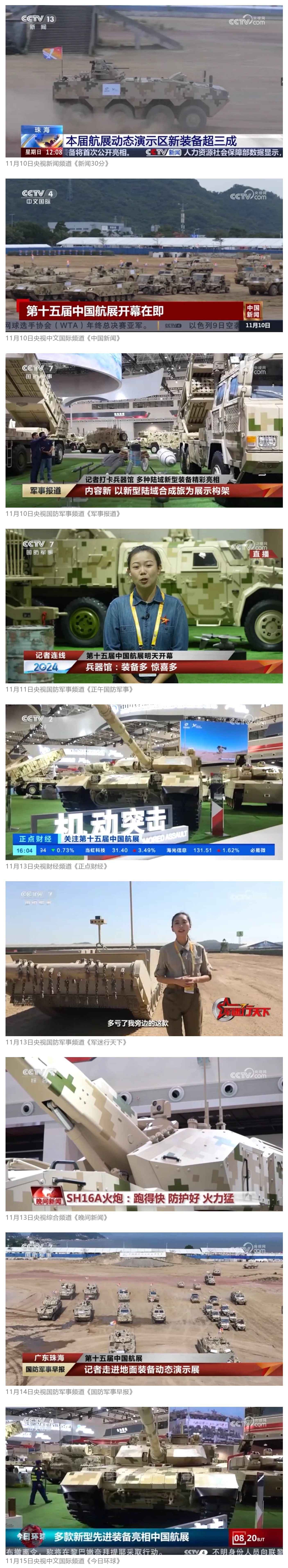 11月13日央視新聞《藍(lán)天之約》直播地面裝備動(dòng)態(tài)演示此次航展,央視綜合頻道《新聞聯(lián)播》《晚間新聞》、新聞?lì)l道《新聞直播間》《新聞30分》《朝聞天下》《共同關(guān)注》《東方時(shí)空》《午夜新聞》、財(cái)經(jīng)頻道《天下財(cái)經(jīng)》《經(jīng)濟(jì)信息聯(lián)播》《正點(diǎn)財(cái)經(jīng)》《第一時(shí)間》、中文國際頻道《今日環(huán)球》《中國新聞》、國防軍事頻道《軍事報(bào)道》《正午國防軍事》《國防軍事早報(bào)》《軍迷行天下》等欄目共播出兵器工業(yè)集團(tuán)參展相關(guān)新聞報(bào)道40余條。11月10日央視新聞?lì)l道《新聞30分》11月10日央視中文國際頻道《中國新聞》11月10日央視國防軍事頻道《軍事報(bào)道》11月11日央視國防軍事頻道《正午國防軍事》