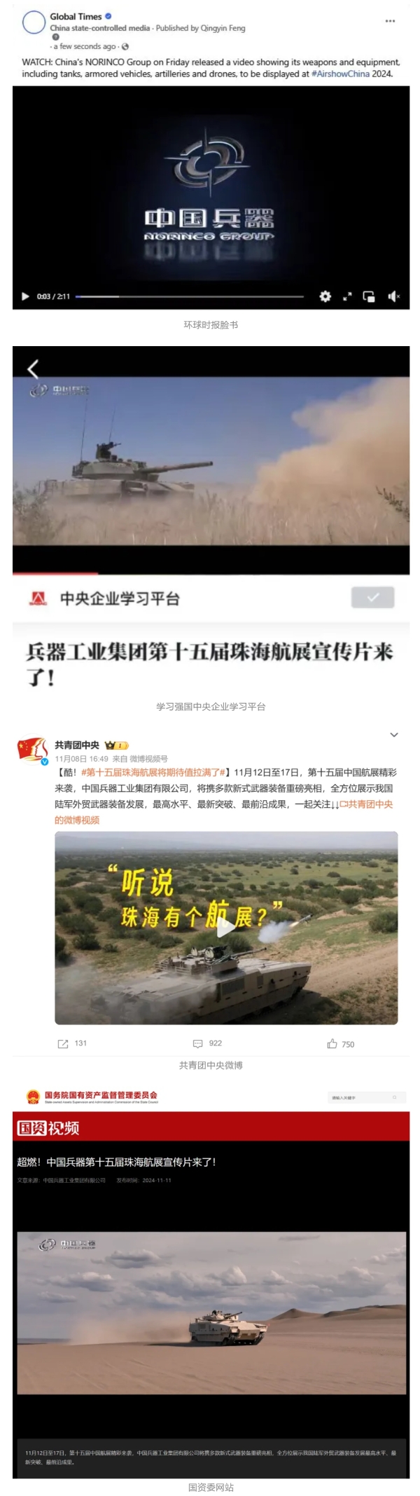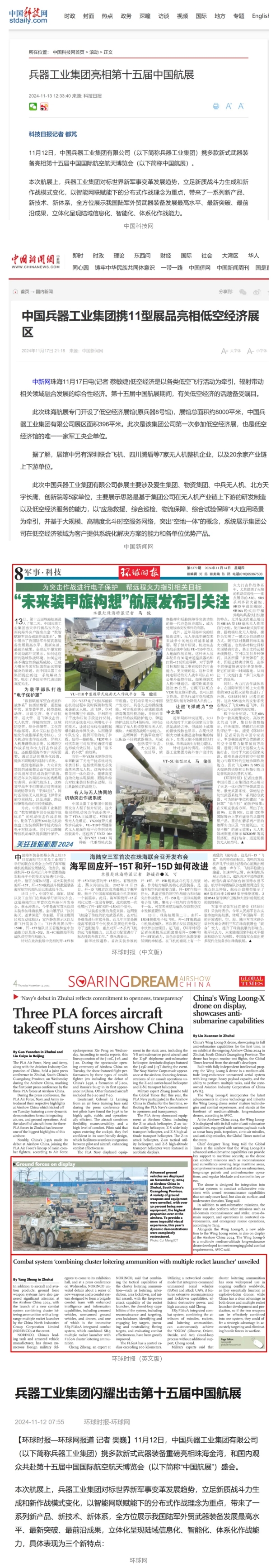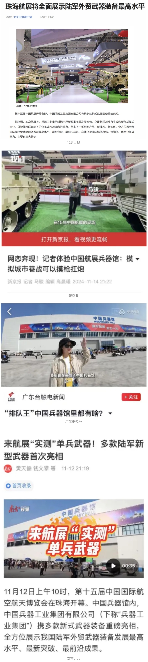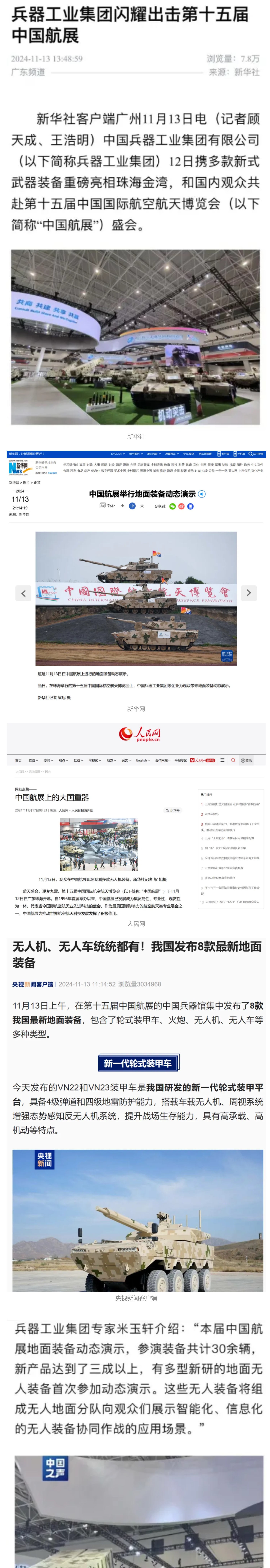 11月13日央視新聞《藍(lán)天之約》直播地面裝備動(dòng)態(tài)演示此次航展,央視綜合頻道《新聞聯(lián)播》《晚間新聞》、新聞?lì)l道《新聞直播間》《新聞30分》《朝聞天下》《共同關(guān)注》《東方時(shí)空》《午夜新聞》、財(cái)經(jīng)頻道《天下財(cái)經(jīng)》《經(jīng)濟(jì)信息聯(lián)播》《正點(diǎn)財(cái)經(jīng)》《第一時(shí)間》、中文國際頻道《今日環(huán)球》《中國新聞》、國防軍事頻道《軍事報(bào)道》《正午國防軍事》《國防軍事早報(bào)》《軍迷行天下》等欄目共播出兵器工業(yè)集團(tuán)參展相關(guān)新聞報(bào)道40余條。11月10日央視新聞?lì)l道《新聞30分》11月10日央視中文國際頻道《中國新聞》11月10日央視國防軍事頻道《軍事報(bào)道》11月11日央視國防軍事頻道《正午國防軍事》