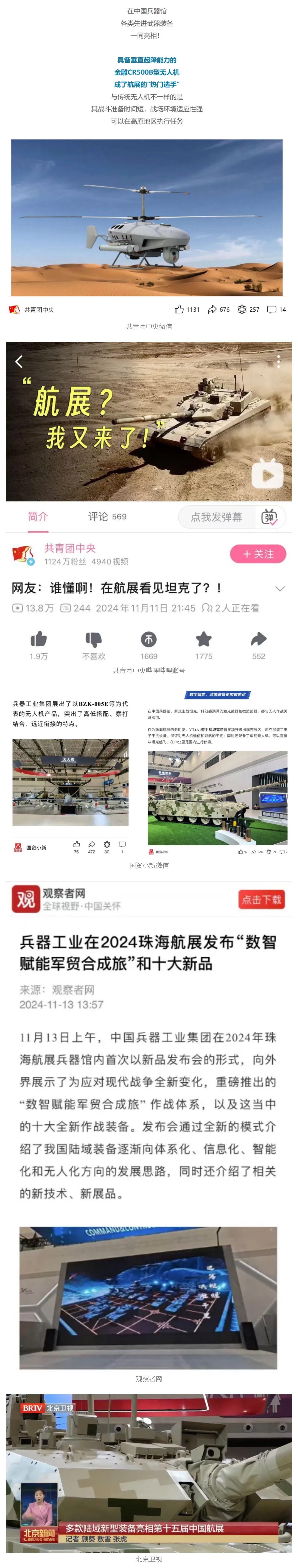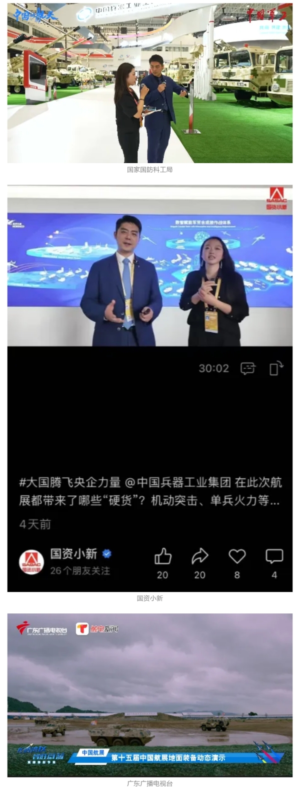 新華社、央視新聞、中央廣播電視總臺(tái)中國之聲、央視軍事、中國軍視網(wǎng)、廣東廣播電視臺(tái)等媒體以及國家國防科工局、國資小新等到兵器工業(yè)集團(tuán)地面動(dòng)態(tài)演示區(qū)、中國兵器館進(jìn)行了直播。