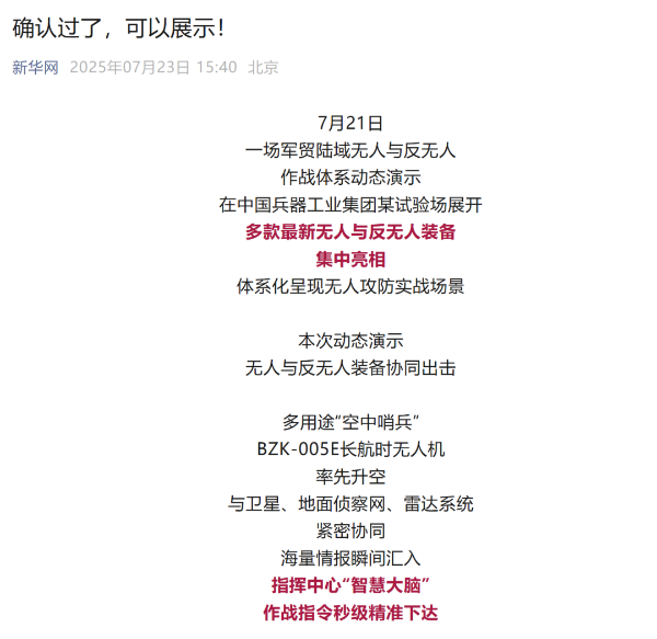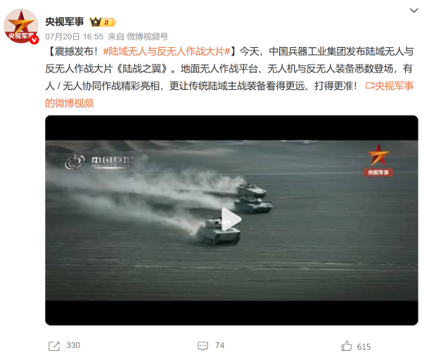 7月21日,中國兵器工業(yè)集團有限公司在位于內蒙古的某試驗場舉辦軍貿陸域無人與反無人作戰(zhàn)體系主題日活動,攜無人機、巡飛彈、反無人機等最新武器裝備登場亮相,展現(xiàn)了一場無人與反無人領域激烈對抗的實戰(zhàn)場景。中央主流媒體、地方媒體、知名網(wǎng)絡媒體,以及集團公司各宣傳平臺紛紛進行報道,多次登上熱搜,引發(fā)廣泛關注。 央視新聞頻道《新聞直播間》《東方時空》《24小時》、國防軍事頻道《正午國防軍事》《軍事報道》《國防軍事早報》、中文國際頻道《今日環(huán)球》、央視軍事新媒體等報道了集團公司軍貿陸域無人與反無人作戰(zhàn)體系首次公開實裝動態(tài)演示有關情況,重點介紹了無人與反無人作戰(zhàn)最新裝備。 央視新聞頻道《新聞直播間》:內蒙古 軍貿陸域無人與反無人作戰(zhàn)最新裝備亮相 央視新聞頻道《新聞直播間》:內蒙古 軍貿陸域無人與反無人作戰(zhàn)最新裝備亮相 記者探訪無人裝備展區(qū) 央視新聞頻道《新聞直播間》:軍貿陸域無人與反無人作戰(zhàn)最新裝備亮相·記者探訪 最強“盾牌” 反無人機系統(tǒng)新升級 人民日報微博、央視軍事微博、央視新聞客戶端、中國新聞網(wǎng)、中新社國是直通車抖音、環(huán)球網(wǎng)微博、環(huán)球時報(X平臺、英文版客戶端)、中國日報網(wǎng)、央視軍事報道微博、中國軍號微博、中央廣播電視總臺“空天逐夢”微信視頻號、共青團中央B站、國資小新微博等中央主流媒體、國家部委的新媒體播發(fā)集團公司陸域無人與反無人作戰(zhàn)大片等視頻作品。 人民日報微博 央視軍事微博 人民日報、新華網(wǎng)、央視軍事、央視新聞、中央廣播電視總臺中國之聲、中國新聞網(wǎng)、中國日報網(wǎng)、中國日報英文報刊《CHINA DAILY》、《科技日報》、光明日報客戶端、環(huán)球網(wǎng)、環(huán)球時報、人民日報海外版-海外網(wǎng)、央視網(wǎng)、小央視頻、參考消息、瞭望東方周刊、共青團中央、國資小新新媒體、新浪網(wǎng)、騰訊網(wǎng)、搜狐網(wǎng)、鳳凰網(wǎng)、網(wǎng)易網(wǎng)等中央主流媒體、國家部委的新媒體及知名網(wǎng)絡媒體對集團公司軍貿陸域無人與反無人作戰(zhàn)體系主題日活動進行了圖文、音頻、視頻報道。 央視軍事微信 人民日報微信 新華網(wǎng)微信 來源/各主流媒體 |